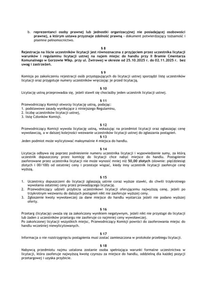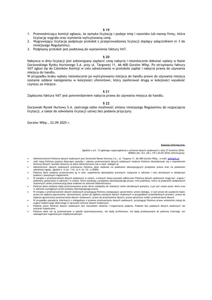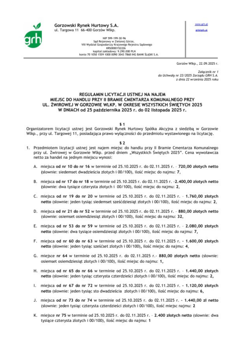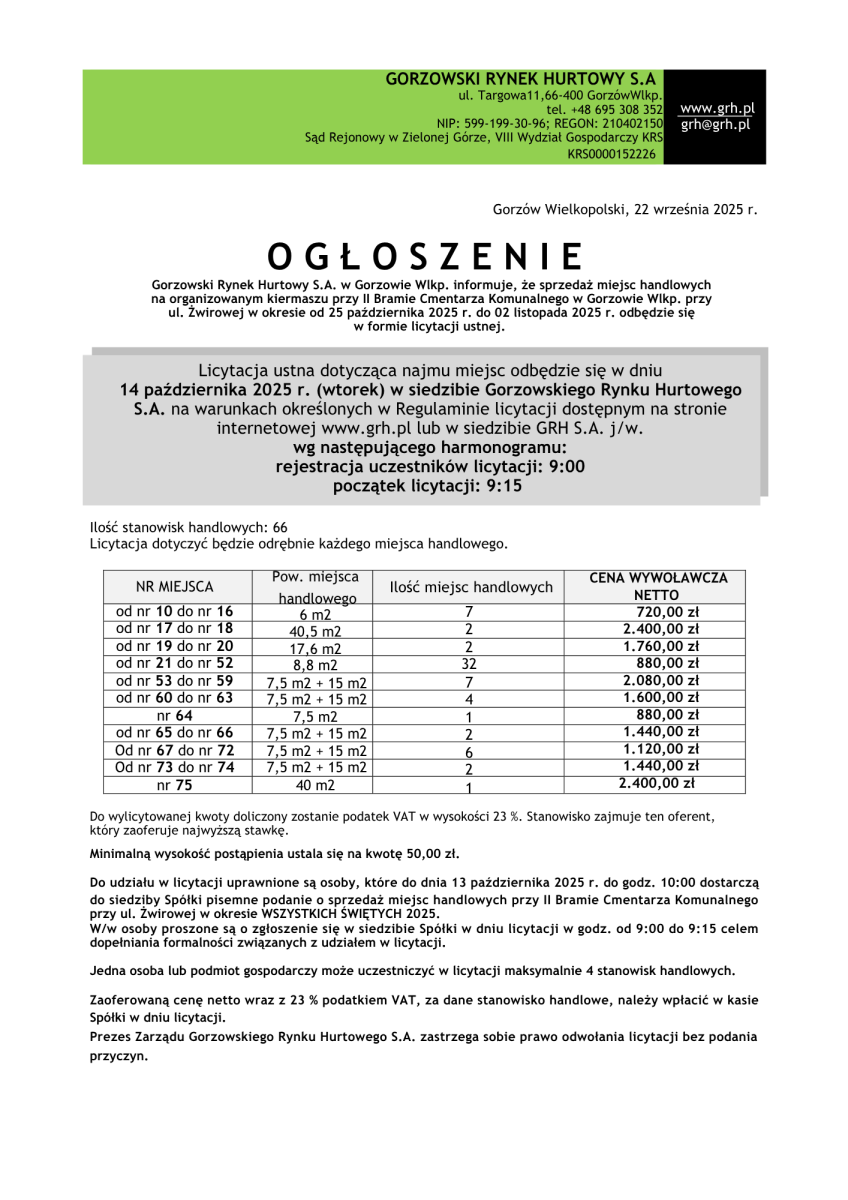 Gorzowski Rynek Hurtowy S.A. w Gorzowie Wlkp. informuje, że sprzedaż miejsc handlowych na organizowanym kiermaszu przy II Bramie Cmentarza Komunalnego w Gorzowie Wlkp. przy ul. Żwirowej w okresie od 25 października 2025 r. do 02 listopada 2025 r. odbędzie się w formie licytacji ustnej.